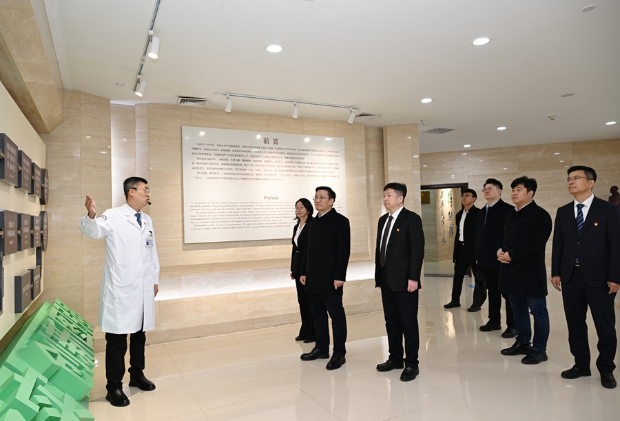 在基础医学院,田辉调研了教育部医药基础研究创新中心实验室、病理生物学教育部重点实验室、动物实验中心及生物样本库等科研平台,实地察看平台建设情况,听取学院在学科建设、师资队伍、人才培养和科研创新等方面的汇报。在病理生物学教育部重点实验室标本陈列馆,他仔细察看馆藏标本和中国数字人解剖系统演示,强调要加强对珍贵教学科研资源的保护与利用。时值白求恩逝世86周年纪念日,田辉指出,要大力传承弘扬白求恩精神,面向国家重大战略需求,深化基础医学与临床医学交叉融合,加快科研成果转化与应用,努力建设具有国际影响力的医学创新高地。