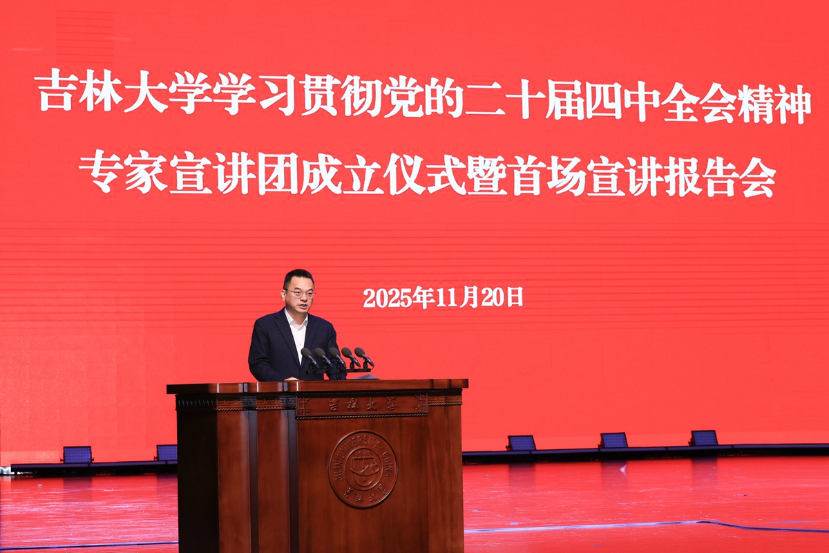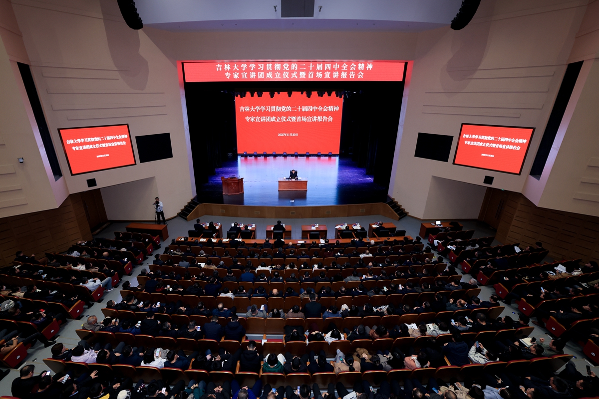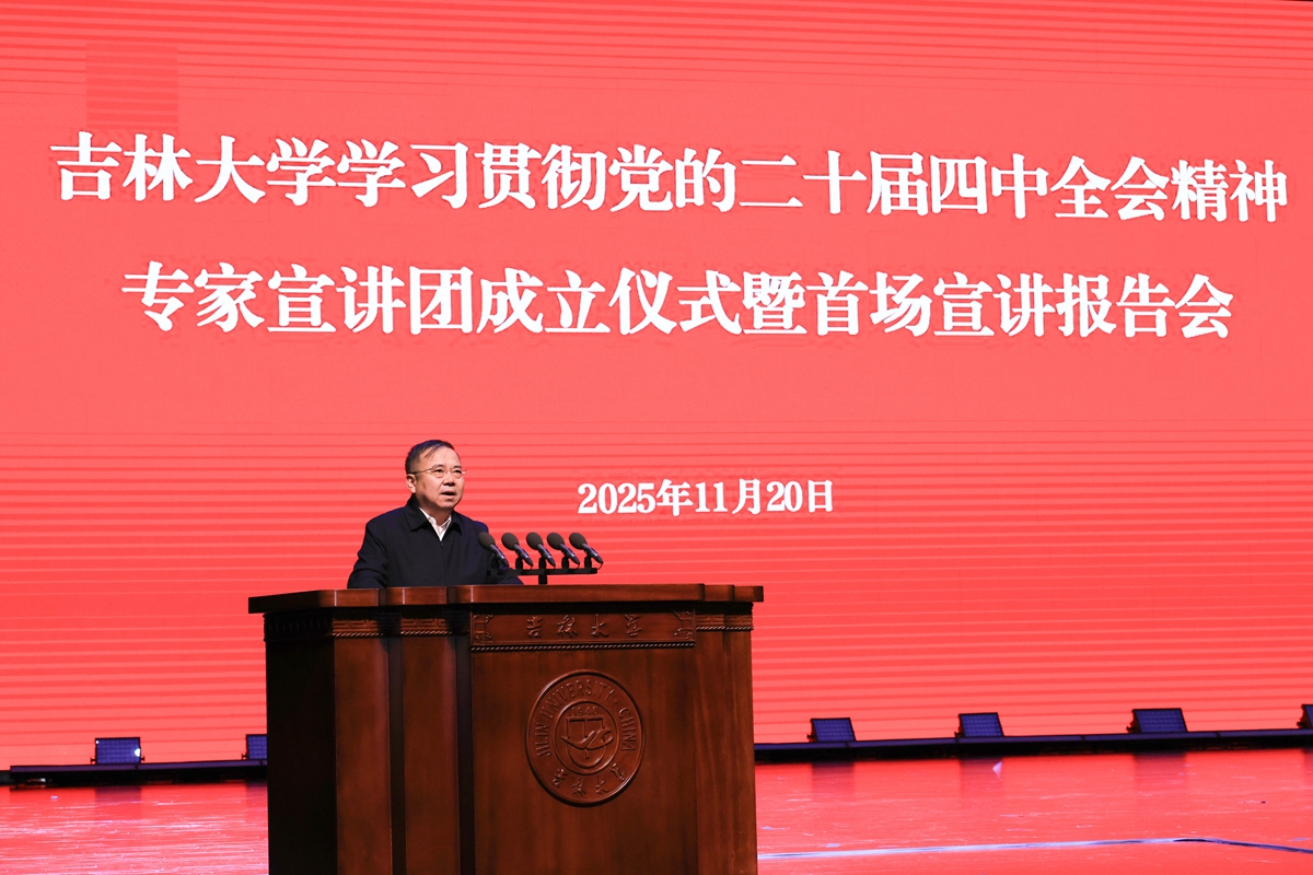 11月20日上午,吉林大学学习贯彻党的二十届四中全会精神专家宣讲团成立仪式暨宣讲报告会在中心校区鼎新大讲堂举行。校党委书记、学习贯彻党的二十届四中全会精神专家宣讲团团长田辉以《深入学习贯彻党的二十届四中全会精神 奋力推动中国特色、世界一流大学建设开创新局面》为题作宣讲报告。