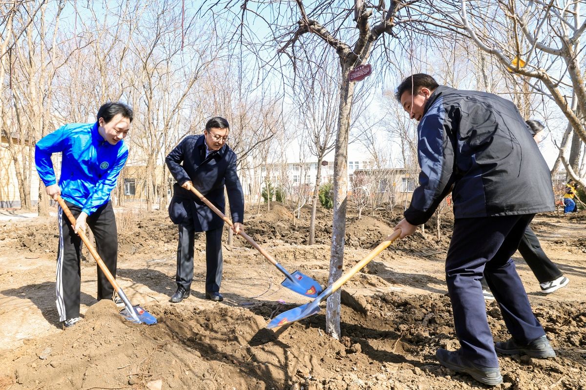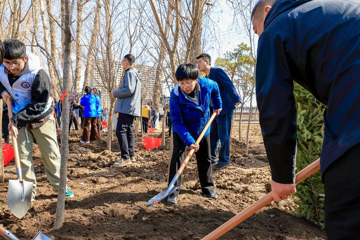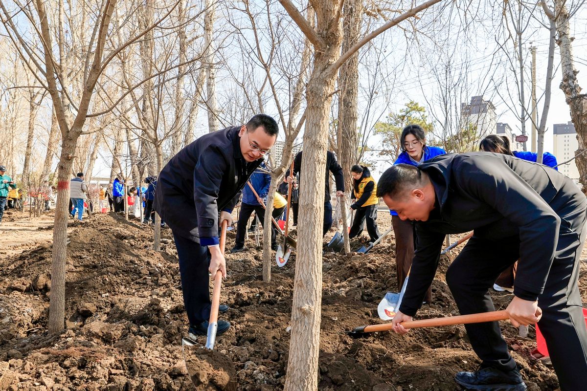 植树点位于和平校区3号院内,校地领导和师生代表在事先划分好的植树区域分工协作、相互配合,一起挥锹铲土、扶苗固正、提水浇灌。田辉、张希一边植树,一边询问同学们的学习生活、劳动锻炼情况,希望同学们不仅把树种在土里,更要把绿色理念种进心里,像树一样向下扎根,向上生长,与小树共同经历风雨,在大学的时光里,努力成为更好的自己。经过紧张劳动,大家合力种下枫树、云杉、海棠、山楂等树苗,为春天的校园种下绿色希望、增添盎然生机。