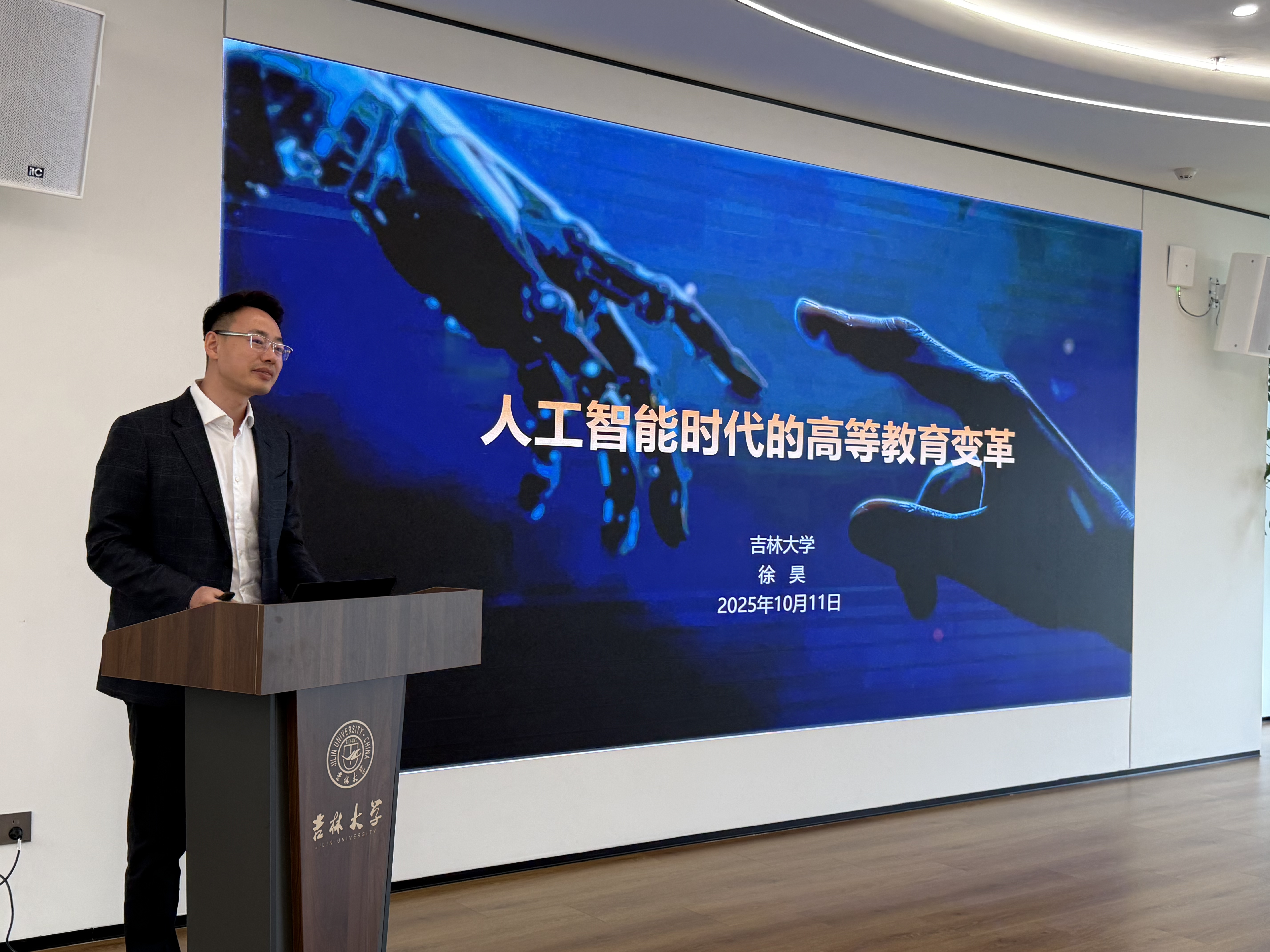 会上,徐昊教授以《人工智能时代的高等教育变革》为题,深入阐释了从“互联网+”到“人工智能+”的范式转变,通过实践案例全面生动地展示了大模型与AI Agent、具身智能、脑机接口等技术的融合应用场景,分析了AI在高校人才培养、科学研究、管理服务等领域的创新应用,并结合学校实际提出应对智能化变革的实践路径和对高校办公室如何利用AI提高工作质效的思考。