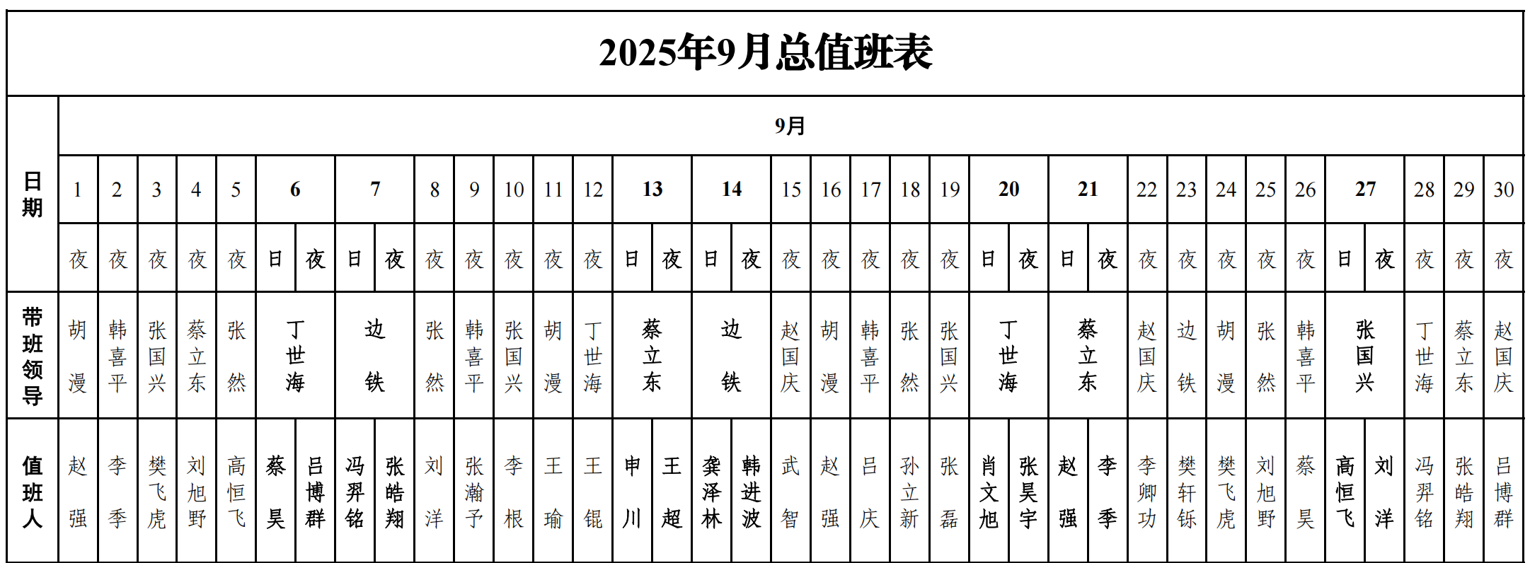 根据上级要求,2025年9月总值班将继续执行校领导带班及24小时专人值班制度。值班人员具体要求:一是按时到岗,尽职尽责,不得擅离职守;二是遇非工作日期间值班时,前后两个班次值班人员要有交接记录;三是遇有重大突发事件,要第一时间报党委办公室(党委办公室主任:郭松洋13844864546;副主任:肖文旭18943680080;工作人员:赵强13364464129),并进行妥善处理,对于迟报、漏报甚至隐瞒不报的,将追究其责任;四是所有重要信息均由党委办公室负责向上级有关部门报送,值班人员不得擅自向上级有关部门、媒体等发布信息。