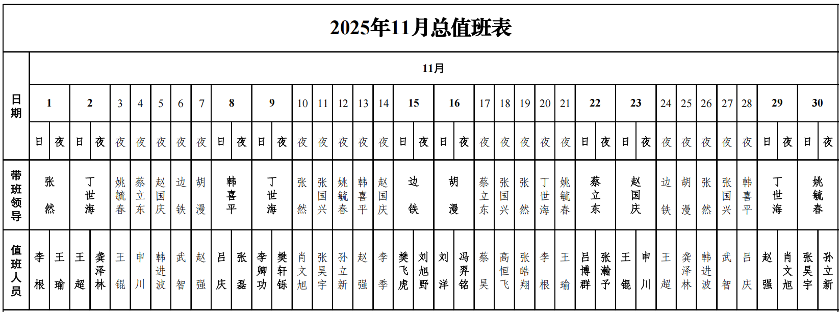根据上级要求,2025年11月总值班将继续执行校领导带班及24小时专人值班制度。值班人员具体要求:一是按时到岗,尽职尽责,不得擅离职守;二是遇非工作日期间值班时,前后两个班次值班人员要有交接记录;三是遇有重大突发事件,要第一时间报党委办公室(党委办公室主任:郭松洋13844864546;副主任:肖文旭18943680080;工作人员:赵强13364464129),并进行妥善处理,对于迟报、漏报甚至隐瞒不报的,将追究其责任;四是所有重要信息均由党委办公室负责向上级有关部门报送,值班人员不得擅自向上级有关部门、媒体等发布信息。